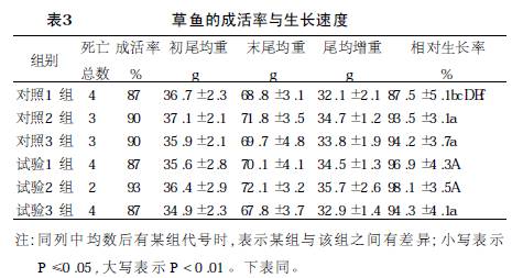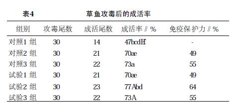 1 .1 .3 供试菌。荧光假单胞菌( P . fluorescens ) 56- 12-10 菌株购自中国科学院水生生物研究所, 金黄色葡萄球菌( St aphyl ococcusaureus) 25922 菌株购自中国科学院菌种所。 1 .2 方法 1 .2 .1 饲 养管理。按表1 配方配制配合饲料,“四定”投饵,水温13 ~20 ℃, 投饵率1 % ~2% 。 1 .2 .2 成活率与生长速度的测定。记录各组草鱼死亡数量,分析原因, 统计各个处理的成活率。分组称取各组鱼的初重和饲养50 d 后的重量, 计算各组鱼的尾均增重与相对生长率。 1 .2.3 攻 毒试验。饲养50 d 后, 从试验组与对照组随机捞取安徽农业科学,Journal of Anhui Agri .Sci .2007 ,35(28) :8910 - 8911 ,8932 责任编辑刘月娟责任校对俞洁草鱼30 尾( 每个重复组10 尾) , 用细金属丝在草鱼身体表面划痕, 再用荧光假单胞菌9 ×106 个/ ml 的活菌液浸泡草鱼30min。继续饲养观察2 周, 记录发病症状、死亡情况, 对死亡鱼体进行解剖检查、分离细菌、确认死因, 计算免疫保护力( RPS) [ 8] 。 1 .2.4 免 疫。用灭菌生理盐水洗下已培养好的平板荧光假单胞菌菌苔, 制取菌液, 采用麦氏比浊法调整菌液含量至9 ×108 个/ ml , 加5 % 福尔马林灭活作为免疫原( Formalin Killed P . fl uorescens ,F- PF) , 加水稀释10 倍后, 分别将各组30 尾草鱼( 每个重复组10 尾) 浸泡1 h,7 d 后重复1 次。 1 .2 .5 凝集抗体效价的测定。距第1 次浸泡后21 和28 d 后,分别从上述草鱼中取10 尾, 从腹主动脉抽取血液, 待凝血后取血清。采用血凝板法测定凝集抗体效价, 反应抗原为F- PF[ 9] 。 1 .2 .6 白细胞吞噬活性的测定。在第28 天抽取血液时, 从中取1 份加肝素钠抗凝, 在0 .5 ml 抗凝血中加入金黄色葡萄球菌( 9 ×108 个/ ml ) 0 .2 ml , 置于培养箱( 25 ℃) 中培养1 h, 后于离心机内3 000 r/ min 离心15 min。取沉淀底层物抹片, 待风干后用甲醇固定, 姬母萨氏染色, 镜检。并且, 计算白细胞的吞噬百分比( PP) 与吞噬指数( PI) [ 10] 。 2 结果与分析 2 .1 草鱼的成活率与生长速度由表3 可知, 经卡方检验,各组间成活率不存在明显差异。试验组与对照组的相对生长率从大到小为试验2 组> 试验1 组> 试验3 组> 对照3 组 > 对照2 组> 对照1 组。经统计分析, 对照1 组与试验1 、2组间差异在0 .01 水平显著, 与试验3 组、对照2 、3 间差异在0 .05 水平显著, 其他组间无差异。可见,0 .08 % 杜仲提取物、大蒜素复方可有效促进草鱼的生长;0 .04% 与0 .12 % 复方的促生长作用接近0 .08% 单方, 说明复方在0 .04 % ~0 .08% 浓度范围内更能协同促进草鱼的生长, 而在0 .08% ~0 .12% 浓度范围内没有协同促生长作用。 2 .2 攻毒后的成活率攻毒后, 各组鱼活动异常,3 d 后鱼体表开始出现红色斑点, 并陆续死亡。对病原菌分离培养, 发现优势菌为荧光假单胞菌。由表4 可知, 各组成活率依次为 试验2 组> 试验3 组、对照3 组> 试验1 组、对照2 组> 对照1 组。经卡方检验, 对照1 组与其他组成活率间存在显著或极显著差异; 对照2 组与试验1 组、对照2 组成活率间存在0 .05 水平显著差异。这说明各组所用添加剂均可有效提高草鱼攻毒后的成活率; 复方组的成活率高于同剂量的杜仲提取物单方组, 接近高剂量的单方组, 表明两种药物复方添加0 .04~0 .08 % 在提高存活率方面具有协同作用。各组添加剂的免疫保护力以试验2 组最高。