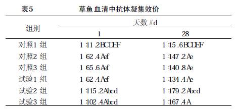 2 .3 凝集抗体效价由表5 可知,28 d 时, 各组鱼的抗体效价达较高水平, 从大到小依次为试验2 组> 试验3 组> 对照2 组> 对照3 组> 试验1 组> 对照1 组。经方差分析, 对照1组与其他组抗体效价均有0 .01 水平显著差异; 对照2 、3 组与试验1 、3 组之间不存在差异, 与试验2 组差异在0 .05 水平显著。这表明杜仲提取物、大蒜素以及不同比例复方均可提高草鱼的抗体效价; 杜仲提取物与大蒜素复方提高草鱼抗体效价的作用, 接近高剂量的单方, 高于同剂量的单方, 说明两种药物复方0 .04% ~0 .08 % 对提高草鱼的抗体效价有协同作用, 但过高剂量的复方抗体效价略有下降, 但没有明显变化。21 d 的情况与此相近。