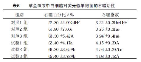 2 .4 白细胞的吞噬活性由表6 可知, 对照1 组的吞噬百分比与对照3 组、试验1 、2 、3 组差异在0 .05 水平显著, 对照2 组的吞噬百分比在0 .05 水平显著低于试验2 组; 对照1 组的吞噬指数与其他各组差异在0 .05 水平显著, 对照2 、3 组的吞噬指数与试验2 组间差异在0 .05 水平显著。这说明杜仲提取物、大蒜素以及复方均可提高草鱼血液中白细胞的吞噬活性; 杜仲提取物与大蒜素复方的吞噬活性高于同样添加剂量的单方, 等同于高剂量的单方, 可见两种药物复方对提高草鱼白细胞的吞噬指数有协同作用。