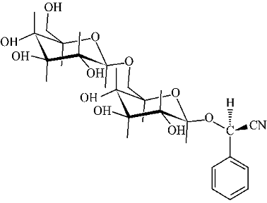 - 苦杏仁苷是传统中药苦杏仁中的有效成分,人们对它的研究已有近二百年的历史,早在1803 年Schrader 在研究苦杏仁成分时就发现了此类物质,直到1830 年Robiquet 等从中分离出苦杏仁苷,迄今它已成为医药上常用的祛痰止咳剂、辅助性抗癌药物,苦杏仁苷广泛存在于杏、桃、李子、苹果、山楂等多种蔷薇科植物果实的种子中,尤其在苦杏仁中含量较多,大约在2 %~3 %。苦杏仁苷分子由一单元苯甲醛、一单元氢氰酸和两单元葡萄糖组成。其分子式为C20 H27NO11 ,结构式为: