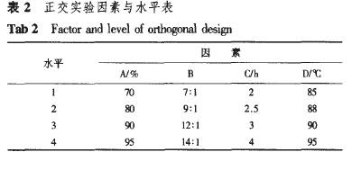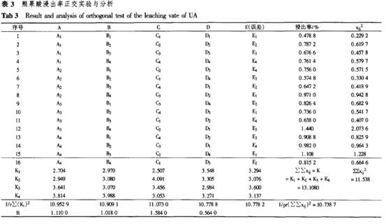 Err 8100 HPLC.pump(Biotronik);BT 8200 HPLC Uv/ⅥS Detector(Biotronik);C.R3A Chromatopac(Biotronik)。 2方法 2.1标准溶液的配制 准确称取熊果酸标准品,用甲醇溶解后配制成浓度为0.804 0 mg·mL~,作为测定样品的标准溶液。 2.2色谱条件 Hypersil C18色谱柱(10 gm,250 toni×4.6 mm),流动相:甲醇.水.乙酸(90:10:0.02),微滤膜过滤流动相后,超声波脱气处理20 min;检测波长220 nm;灵敏度0.08AUFS;流速0.6 mL·min~;温度为25℃。 2.3标准曲线的绘制 准确移取0.804 0 mg·mL“的熊果酸标准溶液0,2.0,4.0,6.0,8.0和10.0 mL,甲醇定容至10 mL,配制成标准系列。在“2.2”项色谱条件下,吸取上述溶液,分别进样6血,每一个浓度重复测定6次。以浓度C(mg·mL。)为横坐标,峰面积A为纵坐标进行线性回归,得到如下回归方程:A=524 170c~902.5,R2=0.999 8。 2.4样品的测定 样品在与标准曲线相同的色谱条件下测定,根据回归方程得到样品中熊果酸的浓度。 2.5检测样品的制备 将分步洗脱得到的洗脱液减压浓缩至干,甲醇溶解,稀释定容至10 mL,按“2.4”项下检测,外标法定量。 2.6大孔吸附树脂的预处理 先用乙醇充分浸泡溶涨大孔吸附树脂,然后以蒸馏水洗至无混浊现象,再用4%HCI浸泡,蒸馏水洗至无Q~存在为止。在50℃真空干燥1 d,备用。 3结果与讨论 3.1正交实验 根据单因素实验结果"1得出:乙醇体积分数(A)、液固比(B)、提取时间(c)和提取次数都不同程度地影响着熊果酸的浸出率。当提取次数达到3次后,浸出率变化不大。而且在实际生产中也不可能进行多次提取,因此选择的回流提取次数为2次。不同的水浴温度(D)可以使提取液的回流速度不同,从而影响浸出率。因此正交实验以乙醇体积分数、液固比、提取时间和提取温度4因素确定[8],正交实验因素与水平选择见表2,熊果酸浸出率的正交实验及计算结果见表3。方差分析见表4。