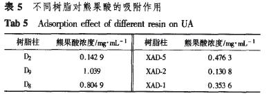 从表3,4可知,提取时间显著影响熊果酸的浸出率,乙醇体积数和液固比对浸出率有一定的影响,提取温度在85~95℃范围内对浸出率没有明显影响。由正交实验结果可以得到最佳提取条件为A3&C2 Dl,即乙醇体积分数为90%,液固比为14.回流时间为2.5 h,回流温度为85℃。在该条件下,熊果酸的浸出率可达到1.44%。 3.2熊果酸的富集 “3.1”项下苦丁茶提取液用20%NaOH调节溶液的pH=9~11,除去大分子杂质,所得滤液用10%飓s04酸化至pH=1。2,过滤所得沉淀,水洗至近中性,50℃真空干燥,得到熊果酸富集物。、采用“2.4”项下方法分析其中的熊果酸纯度为28.05%。 3.3大孔吸附树脂对熊果酸吸附性能的研究 3.3.1大孔吸附树脂对熊果酸的静态吸附性能分别称取6种大孔吸附树脂8 g,按“2.6”项下方法对树脂进行预处理,湿法装柱。甲醇溶解熊果酸富集物,浓度为1.3l mg·ml-1,再用极性调节剂以1:1稀释后上柱,静态吸附1 h后,先以H20洗至无色,再以90%乙醇洗脱至无三萜反应[9],按“2.5”项下方法处理洗脱液,结果见表5。