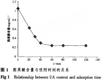 从表5可知,D8,聩树脂对熊果酸的吸附量较高,而XAI)-2树脂最低,但试验表明:XAD-2树脂吸附杂质的能力很强,而XAD-5,XAD-I树脂对熊果酸的吸附能力较强,90%乙醇洗脱时很难使熊果酸解吸完全,洗脱速度明显比其它4种树脂慢。因此,选择聩,马树脂富集熊果酸,XAD-2树脂纯化熊果酸进行研究。从几种树脂的主要技术参数分析,粒径为0.6~1.42 mm的树脂适合于富集熊果酸,而粒径为0.35~1.30 mm的树脂不适合于富集熊果酸。 3.3.2洗脱剂种类的选择根据绿色清洁工艺的要求,采用乙醇.水体系为洗脱剂不仅避免了以往硅胶柱色谱富集熊果酸时有毒有机溶剂的使用,而且乙醇回收后可以重复使用,降低了生产成本,为产品的产业化开发提供了保证。因此,本研究选用乙醇一水为洗脱剂。 3.3.3吸附时间的确定精确称取经预处理活化的D8大孔 吸附树脂1.000 g于100 mL烧杯中,以熊果酸含量为1.05mg·mL。1的样品30 mL加入到烧杯中,吸附20,30,45,60,90和120 min后依次取样,按“2.4”项下分析方法检测,结果见图1。