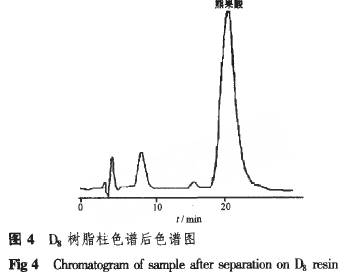由图3可知,洗脱剂pH对洗脱能力有显著的影响u[10]。随着洗脱剂碱性的增强,洗脱能力逐渐增强,当洗脱剂pH≥11时,洗脱能力达到最大值。因此,选择洗脱剂pH=11为宜。这是因为,通过改变洗脱剂pH值,使熊果酸以离子型存在,很容易被洗脱下来,从而提高了洗脱率。当洗脱剂pH≥11时,熊果酸的回收率可达gr7.82%,纯度可达95.0%。 “2.4”项下色谱条件下,对D8树脂吸附后的产品进行分析,结果见图4。可见,D8树脂可以有效地纯化熊果酸。采用XAD-2树脂进一步进行纯化可以获得更高纯度的产品。