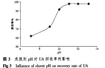 由表6可知,水一30%乙醇不能洗脱熊果酸。随着洗脱剂乙醇体积分数的增大,洗脱能力逐渐增强,70%乙醇对熊果酸有一定的洗脱能力,90%乙醇的洗脱能力最强,为70%乙醇洗脱剂的5倍。在洗脱过程中。如果洗脱剂分子与吸附树脂的亲合力大于目标物质与吸附树脂的亲和力,就可以将该目标物质置换而洗脱下来。因此,洗脱时,先用与吸附剂亲合力小的溶剂,然后逐渐改变洗脱剂的极性,将与吸附剂亲和力更强的物质洗脱下来,以达到良好的分离效果。本实验采用D型非极性大孔吸附树脂为吸附剂,乙醇.水为洗脱剂,因此,洗脱剂的极性越强,洗脱能力越弱;洗脱剂的极性越弱,洗脱能力越强。这与高效液相色谱检测所选流动相的组成是一致的。 3.3.5样品溶液pH的选择甲醇溶解熊果酸富集物,再用极性调节剂以1:I稀释,分别调节样品溶液的pH为2.87,4.64,7.07,9.23,II.25后,D8树脂柱静态吸附l h,水洗至无色,30%乙醇、90%乙醇各200 mL洗脱,收集90%乙醇洗脱液,洗脱液按“2.5”项下方法处理,结果见图2。 从图2可以看出,当样品溶液的pn=7.07时,树脂对熊果酸的吸附量最大,柱后流出液中熊果酸的含量最小,因此,选择样品溶液pH为6—7有利于熊果酸的吸附。当pH> 7.07时,熊果酸的吸附量逐渐下降,主要是因为熊果酸酸根离子的浓度增大,从而增大了熊果酸在洗脱剂中的溶解度,减小了与大孔吸附树脂的作用力,不利于吸附。实验中观察到,当样品溶液的pH为2.87,4.64时,水洗脱时有三萜酸沉淀析出,因此,酸度过低也不利于熊果酸的吸附。 3.3.6洗脱剂pH的选择平行装5根D8树脂柱分别命名为1,2,3,4,5,取浓度为1.31 nag·mL“熊果酸富集物溶液10.00 mL,10.00 mL极性调节剂稀释后,调节pn=6.58,上样,静态吸附1 h后,分别水洗至无色,30%乙醇200 mL洗脱,再分别用pH=7,9,10,11,12,13的90%乙醇洗脱剂200mL洗脱至无三萜反应,控制洗脱流速为2—3 mL·min~,将90%乙醇洗脱液酸化至pn:4.0,过滤,所得沉淀水洗至中性后,甲醇溶解定容至10.00 mL,按“2.4”项下分析方法检测,外标法定量,结果见图3。