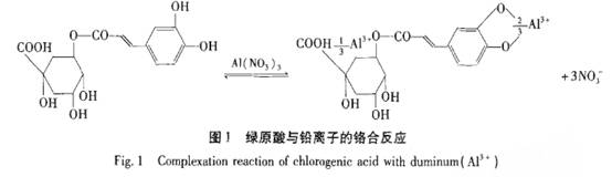 袁华,邓良,孙炎彬,杨小俊,闫志国,吴元欣+ (武汉工程大学化工与制药学院,武汉430073) 摘要:研究杜仲叶中绿原酸含量的检测方法。利用绿原酸和铝离子的络合显色反应,采用可见分光光度法在波长530 nm处测定杜仲叶中绿原酸量。绿原酸质量浓度在1.7×10-4~一1.O×10-2~g·L-1。1之间线性关系良好,线性相关系数为0.9995。秋、夏叶中加标回收率分别为98.0%,101.0%。该方法简便、实用、准确。 关键词:杜仲叶;绿原酸;可见分光光度法 杜仲(Eucommia Ulmoides 0liv.)是我国特有的经济树种,其药用价值历来受到人们关注,2000多年前的《神农本草经》就将之列为中药上品,杜仲具有降血压、补肝肾、强筋骨、抗衰老、抗肿瘤等功效。近来的研究证实杜仲叶与皮的化学成分基本一致,其中绿原酸(Chlorogenic acid)是杜仲起药理作用的主要有效成分之一[1-2]。因此,和金银花、杜仲皮等原料比较,从廉价的杜仲叶中提取绿原酸是一种更为经济合理的工艺方法。绿原酸的分析检测方法包括薄层扫描法、导数极谱法、紫外分光光度法、化学发光分析法、气相色谱法、高效液相色谱法等多种分析方法[3-6]。现有的绿原酸定量分析大多需要专门的分析仪器设备,对于实验室一般经常性分析来说,费用过高而且不及时,因此非常有必要寻找一种依靠简单仪器和适合基层操作的快速、准确的检测分析方法。 本文在前人工作的基础上,利用绿原酸和铝离子的络合显色反应,采用可见分光光度法测定杜仲叶中的绿原酸。该方法仪器简单、方法简便、结果准确,满足了实验室和生产常规分析检测的需要。 1材料与方法 1.1 测定原理 根据绿原酸类物质在碱性条件下与铝离子形成稳定的紫红色络合物,并产生特征吸收光谱而进行测定。反应式如图1所示。