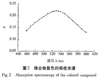 1.2主要仪器和试剂 1.2.1 主要仪器 721型分光光度计(上海分析仪器三厂); 紫外分析仪(上海顾村电光仪器厂)。 1.2.2主要试剂及标准溶液的配制 硝酸铝、亚硝酸钠、乙醇、氢氧化钠均为分析纯。 杜仲叶采自湖北五峰县。 绿原酸标样(中国药品生物制品检定所)。 绿原酸标准溶液:用分析天平准确称取绿原酸标准品0.0100 g,用95%乙醇溶解于500 mL的容量瓶中并定容,配制2×10-2g·L-1的绿原酸标准溶液。 1.3绿原酸溶液吸光度测定 取绿原酸标准溶液~定体积于10 mL容量瓶中,加入0.5 mL 5%的NaN0,和0.5 mL 10%的Al(N03)3静置5 min,再加人2 mL 1 mol·L-1的NaoH溶液并用体积分数95%乙醇定容,以95%乙醇作空白溶液,在530 nm处测定吸光度A。 1.4杜仲叶预处理及绿原酸量测定 准确称取10.0 g杜仲叶,用40%乙醇溶液按料液比为1:14,在80℃下回流提取150 min,重复提取3次。通过薄层色谱分析,在紫外分析仪下观察荧光现象,发现第3次提取液中显示绿原酸的蓝色荧光非常暗淡,说明从杜仲叶中第3次提取的绿原酸含量非常低。因此合并第1次和第2次提取液,将提取液浓缩定容于200 mL容量瓶中。吸取100 uL提取液,点样于20 cm×10 cm硅胶G薄层板上成2 cm均匀带状,用v(乙酸乙酯):v(甲醇):v(水)=10:4:3作展开剂,按常规操作展开。风干薄板,划出与标准品相同位置展开点的谱带,刮下吸收带部分的硅胶置于50 mL锥形瓶中,用10 mL体积分数80%乙醇溶液洗脱30min,将洗脱液定容至20 mL,分别量取绿原酸样品溶液1.0,2.0,3.0,4.0,5.0mL于10 mL容量瓶中定容,按1.3方法显色并测量吸光度A,计算杜仲叶样品中绿原酸的含量。 2结果与讨论 2.1 络合物显色的吸收光谱 配制一定浓度的绿原酸标准溶液,按1.3实验方法操作,吸光度A结果见图2。由图2可见,吸收峰在530 nm处最大,因此选用530 nm为测定波长。