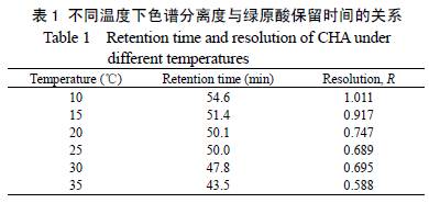 3.2 柱温对分离效果的影响 在0.5 mg/mL(湿凝胶,下同)的负载量下,分别在不同温度下进行色谱分离,考察温度与绿原酸保留时间的关系,结果如表1 所示. 在10~35℃温度下保留时间变化不大. 10 ℃时进行色谱分离,绿原酸的分离度为1.011,分离效果最好. 随温度升高,分离度下降,35℃ 时绿原酸的分离度降低到0.588. 这是由于在绿原酸的分离过程中,分子间氢键是比较主要的