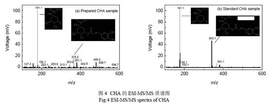 作用力. 氢键对温度敏感,所以温度改变对绿原酸分离度影响很大. 3.3 柱负载量的测定 取进样量为1~50 mg,对不同的进样量分别计算目标产品绿原酸和相邻前一杂质的分离度(绿原酸与相邻后一杂质均为基线分离,故不予考虑),结果如图3 所示. 从图可以看出,在0.5 mg/mL 的高负载量时,绿原酸的分离度在0.50 左右,纯度保持在80%左右. 3.4 绿原酸样品的质谱鉴定 对制备的绿原酸样品进行质谱鉴定和分析,方法见文献[19]. 收集制备的绿原酸样品在Waters Quattro Premier XE 串联四极杆质谱仪上进行电喷雾质谱(ESI-MS/MS)鉴定,结果如图4 所示,其中峰353.1 为绿原酸的分子离子峰,峰375.2 为结合了一分子钠的绿原酸的负离子的质谱峰. 与标准品对照发现,所制样品同标准品的质谱较一致,表明所制样品为绿原酸,且杂质很少. 通过质谱检测可知,金银花的绿原酸提取物经寡聚环糊精键合的凝胶介质纯化后,各种成分得到了有效分离,可以制得高纯度绿原酸. 图5 是绿原酸在质谱中被轰击后的裂解过程示意图. 绿原酸受到轰击后,裂解成为咖啡酸的正离子状态和奎尼酸的负离子状态. 裂解过程有2 个途径,一个是绿原酸的负离子直接裂解为咖啡酸的正离子状态和奎尼酸的负离子状态,另一个是结合了1 分子钠的绿原酸的负离子裂解为咖啡酸和奎尼酸.