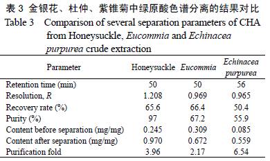 3.7 金银花、杜仲、紫锥菊中绿原酸的分离纯化 为了考察本研究方法对不同药材中绿原酸的分离效果,选取金银花、杜仲、紫锥菊3 种药材的绿原酸粗提物,分别进行了绿原酸的分离纯化,得到绿原酸的精制产品,结果如表3 所示. 由表可以看出,本研究方法得到的3 种药材的绿原酸分离度均达到0.96 以上. 精制 后金银花中绿原酸产品纯度达97%,纯化倍数达3.9,紫锥菊中绿原酸的纯化倍数最高,达6.54,这可能与紫锥菊的粗提物本身绿原酸的含量很低有关.