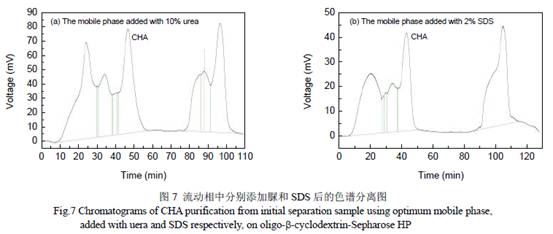 3.8 分离机理 绿原酸类物质是由咖啡酸与奎尼酸形成的酯,其分子结构中有疏水性的母核和亲水性的侧链基团—羟基.绿原酸类化合物能与环糊精配基同时发生氢键作用和疏水作用,从而为色谱分离过程提供保留作用力[20]. 在优化后的流动相中添加脲和十二烷基磺酸钠(SDS),以分别掩盖色谱分离过程中的氢键和疏水作用,进而探讨了绿原酸的分离机理,结果如图7 所示. 由图7(a)可见,在流动相中添加10%脲后,绿原酸的保留时间由50 min 降为40 min,且前一杂质的色谱峰消失,绿原酸和前一杂质的分离度从1.208 下降到0,这表明氢键在绿原酸的分离过程中起了十分重要的作用,与温度对绿原酸的分离影响一致. 由图7(b)可以看出,添加2% SDS 后,绿原酸的保留时间同样由50 min降为40 min,绿原酸和前一杂质的分离度下降到0.40,这表明疏水作用同样对绿原酸的分离纯化有重要影响.