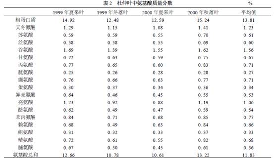 张军民,高振川,张琪,姜云侠 牛爱华,胡映霞 (中国农业科学院畜牧研究所,北京 100094) (中国农学会杜仲办,北京 100710) 摘要:对不同产地和不同收获季节的杜仲叶常规营养成分、杜仲叶及其提取物中药用成分进行了研究,结果表明不同收获季节的杜仲叶营养有差异,杜仲叶及其提取物中含有较高的绿原酸和单宁。生产实践中,可利用秋末落叶作为很好的饲料资源。 关键词:杜仲叶;营养成分;药用成分 杜仲( Eucom mia ulmoides oliv , EU) 是我国特有的经济植物。传统以树皮入药,近年来研究表明,杜仲叶与皮的化学成分基本相同,药效类似[1 ] 。杜仲叶含有蛋白质、脂肪、维生素、矿物质元素等营养成分,以及绿原酸、桃叶珊瑚甙和松脂醇- 葡萄糖苷等药用成分[2 ,3 ] 。我国杜仲资源约300 多万亩,夏叶、秋叶可采摘量和秋后老叶合计约100 多万吨,但大部分被浪费掉了。本文对不同产地和不同收获时间的杜仲叶常规营养成分和杜仲叶及其提取物中药用成分进行了研究,为合理开发我国这一特有资源提供依据。 1 材料与方法 1. 1 杜仲叶和杜仲提取物来源 收集来自不同的产地或收获时间的杜仲叶,包括在河南1998 年秋末落叶、陕西略阳1998 年秋末落叶、北京顺义1998 年秋末落叶和冬落叶、1999 年夏叶(采摘) 和秋落叶及2000 年夏采叶和秋落叶。杜仲叶提取物由陕西省略阳杜仲工业公司提供,其杜仲叶浸膏粉生产工艺如下:杜仲干叶精选v漂洗v提取v过滤v沉淀v过滤v杀菌v低温浓缩v喷雾干噪v晒粉v降温v检验v包装v入库。产品得率为8 %~10 % ,产品水分≤6 % ,溶解度≥98 % ,细度100 目。 1. 2 杜仲叶和杜仲叶提取物营养和药用成分分析 杜仲叶粗蛋白质用凯氏定氮法测定;氨基酸含量用氨基酸自动分析仪测定;绿源酸和单宁采用比色法测定。 2 结果分析 2. 1 杜仲叶中常规成分质量分数 对北京、河南、陕西所产的杜仲夏叶、秋叶和冬叶中的常规营养成分的测定结果列于表1 。从表1 可知,所有分析绝大部分样品的水分质量分数为8.41 %~10. 43 % ,粗蛋白质质量分数为9. 09 %~14.92 % ,粗纤维质量分数为12. 04 %~13. 43 % ,精脂肪质量分数为5. 92 %~9. 54 % ,粗灰分质量分数为7.20 %~12. 59 %。其中河南省1998 年秋末落叶粗灰分质量分数达17. 5 % ,可能是采收、运输中被砂土污染,由此其蛋白质质量分数也低,为6. 7 %。陕西略阳1999 年秋末落叶样品纤维质量分数高达17.24 % ,可能是杜仲品质或样品采收、处理过程中叶肉丢失过多。所分析的杜仲叶均含有较丰富的钙(1.38 %~2. 04 %) ,但磷的质量分数比较低(0. 13 %~0.21 %) 。不同产地和不同收获季节的杜仲叶营养成分有一定的差异,但应注意防止污染和叶片损失。夏季采摘的杜仲叶和秋季落叶质量较好。 2. 2 杜仲叶中氨基酸质量分数 对1999 年和2000 年北京顺义产的4 个杜仲叶粉样品进行了氨基酸测定,结果列于表2 。从分析结果看,杜仲叶风干样品中的粗蛋白质含量高于玉米、谷、高梁和薯类,与大麦、小麦、麦麦夫相当;而赖氨酸、蛋氨酸、苏氨酸,无论风干样中还是蛋白质中,其含量均高于麦类。总的看来,杜仲叶的蛋白质具有良好的氨基酸组成。 2. 3 杜仲叶和杜仲叶浸膏粉中绿原酸和单宁质量分数 对杜仲叶及其提取物中绿原酸和单宁含量的测定结果见表3 。由表3 可知,杜仲叶含有较高的绿原酸和单宁,5 个杜仲叶样品的绿原酸质量分数平均为2. 21 % ,单宁质量分数平均为1. 56 %。杜仲叶浸膏中绿原酸质量分数为5. 25 % ,单宁质量分数为9.98 %。不同季节杜仲叶所含的绿原酸和单宁有一定的差别。冬季落叶中含绿原酸和单宁都较低。