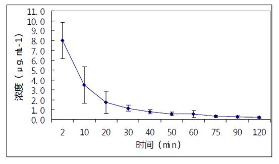 Fig.1 HPLC chromatograms of meglumine emodin reference substance (A) ,blank plasma(B), plasma with drug(C), and plasma with drug added reference substance(D) 6 只犬静脉推注大黄素脯甲胺后,测得大黄素脯甲胺平均血药浓度-时间曲线见图2。
