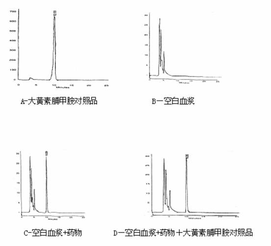 2.6 日内与日间精密度:含大黄素脯甲胺低、中、高浓度血浆0.086、1.075、5.375μg.mL-1,按2.2 项下操作后进行HPLC 测定,在48h 内测定6 组,结果48小时内RSD 值为3.51%,2.45%,1.89% 。 2.7 稳定性:按标准曲线配制方法配制含大黄素脯甲胺浓度为0.26μg.mL-1、3.25μg.mL-1、16.25 μg.mL-1血浆样品,每个浓度5份,每隔5天按2.2项下操作后进行HPLC 测定1份,考察样品在-20℃冷冻放置条件下的稳定性 。结果3种浓度的大黄素脯甲胺血浆样品在2 0天的稳定性较好,RSD 值为4.58%,4.29%,4.35.%。 2.8 检测限:以信噪比(S/N)为3 时的大黄素脯甲胺对照品浓度为本HPLC 方法的检测限,取空白犬血浆,使血浆中大黄素脯甲胺标准品的浓度为0.02μg.mL-1、0.040μg.mL-1、0.080μg.mL-1,分别取 0.40 mL 血浆,按2.2 项下操作。结果本法的检测限达0.013μg.mL-1。 2.9 专一性:由色谱图1 可以看出,犬血浆内源性物质与大黄素脯甲胺能很好地分离,均已达到基线分离效果,含大黄素脯甲胺血浆,处理后加入大黄素脯甲胺对照品溶液,峰重叠,表明专一性良好,成为标准曲线法定量分析犬血浆大黄素脯甲胺浓度的前提。 2.10 数据处理:应用中国药理学会委员会编制的3P97 药动学计算软件进行处理 大黄素脯甲胺血浆药物浓度。 3 结果 3.1 各样品色谱图:见图1。大黄素脯甲胺对照品色谱图显示大黄素脯甲胺对照品的色谱峰均一,定量99.5%,保留时间为10.101min,从犬的空白血浆色谱图可以看出血浆杂质出峰比较靠前,在大黄素脯甲胺保留时间前后,无明显杂质峰,犬含药保留时间为10.228min,犬含药血浆处理样品加入黄素脯甲胺对照品保留时间为10.232min。 3.2 大黄素葡甲胺血药浓度-时间曲线