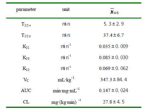 图2 大黄素葡甲胺静脉推注犬血药浓度-时间曲线 Fig.2 The curve of plasma drug concentration and time afte iv meglumine emodin 3.3 大黄素葡甲胺药物动力学特性 大黄素脯甲胺静脉推注在犬体内的药动学过程符合二房室模型,其主要药动学参数见表2。 表 2 大黄素葡甲胺静脉注射犬体内药动学参数 Table 2.The pharmacokinetic parameters in dogs after venous injection meglumine emodin parameter unit