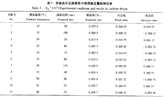 2.4回收率测定 精密称取3份豚草茎粉.每份50克,分别加入绿原酸标准晶2毫克。按照确定的方法制备分析样品,并在选定的色谱条件下分析绿原酸的含量,测得平均阿收率96.1%见表2。 3结果与讨论 3.1 结果 通过均匀实验的结果分析表明,超声提取的最佳条件是以水作为溶剂,在60℃下提取70min。在最佳条件下测得豚草茎中绿原酸提取率0.0407‰。以95%乙醇为夹带剂超临界CO2萃取豚草茎中绿原酸,测得提取率为0.001877‰ 4讨论 实验是通过UⅡ*(11 2)均匀实验没计表(见表3)进行的,连同结果一并列于表中。