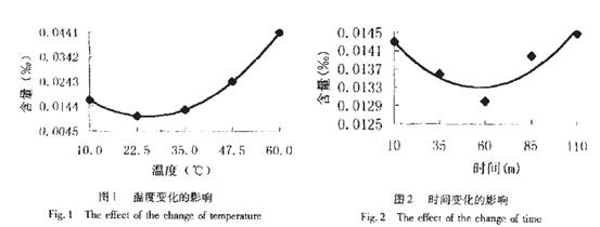 赵昕 袁晓颖 付玉杰 张莹 (东北林业大学森林植物生态学教育部重点实验室,哈尔滨150040) 摘要:以高效液相色谱法作为绿原酸含量的检测方法,用超声提取法从豚苹茎中提取绿原酸以制备分析样品,结果表明超声提取的最佳条件为:以蒸馏水为提取溶剂,在60℃下超声提取70min。 关键词:豚草;绿原酸含量;超声波提取法;高效液相色谱法 绿原酸(Chlorogenic acid)是由咖啡酸(eaffeiacid)勺奎尼酸(quinic acid)组成的缩酚酸,是植物体在有氧呼吸过程中经莽草酸途径产生的一种苯丙索类化台物。医学上具有利胆,抗菌,降压,增高白血球及兴奋中枢神经系统等多种药理的作用[1]。为众多药材(如金银花、杜仲)以及中成药(如复肝宁、粉刺口服液等)的主要成分。因此探讨制备绿原酸分析样品的最适提取工艺条件对于其他富含绿原酸的植物资源的利用有着重要的指导意义。 近年来绿原酸含量的提取方法主要有水提醇沉[1]、醇提铅沉、水提石灰乳沉淀法等[3]。水提醇沉使得绿原酸在提取过程中有一些损失,醇提铅沉给产品带来重金属铅的污染,水提自-灰乳沉淀法存在着得率较低、易分解的缺点。以上提取方法作为绿原酸分析样品的提取方法存在结果偏低的问题.故本文以高效液相色潜法[3,5-7]作为测定豚草茎中绿原酸含量的方法,以水为溶剂超声提取和95%乙醇为夹带荆超临界萃取豚草茎中绿原酸制备了分析样品,测定了豚草茎中绿原酸含量。 l仪器和材料 DK-98-1电子恒温水浴锅,JASCO高效滴褶色谱仪,975型紫外检测器,BIOFUGE22R高速冷冻离心机,ABl04型电子天平,PHARMARIA恒温水浴,DS-300A超声波清洗机,HALZL-50- Ol超临界CO:苹取仪。乙腈、甲醇为色谱纯.其余试剂均为分析纯。绿原酸标准样品由中国药品生物制品检定所提供.豚草于2001年8月采于牡丹江地区,取其茎于80%烘干至恒重,粉碎至40目。 2实验方法 2.1 绿原酸含量的高效液相色潜分析 2.1.1色谱条件 色谱柱KYATECH(日本)ODS柱(4.6mm×25cm,5Um);流动相:乙腈:水:冰乙酸(体积比)=10:90:5;流速:lmL/min;检测波长:325 nm;进样量10uL。 2.1.2标准溶液的配制 精密称取绿原酸标准样品10mg于100mL容量瓶中,以甲醇为溶剂超声助溶,待冷却至室温定容,备用。 2.1.3标准曲线的绘制 分别精密吸取绿原酸标准溶液0.125、0.25、0.5、 1、2、4、6、8mI.于10mL容量瓶中,用甲醇稀释量刘度摇匀。按照上述色谱条件分别取稀释后样^6及原标准溶液进样分析。每个样重复三次,取峰嘶积平均值,得峰面积(Y)与绿原酸浓度(X)的线性回归方程为:Y=2×107X一3l 962,相关系数R=0.999。在该条件下,绿原酸浓度的线性范围为0.001 25~0.01 mg/mL。 2.1.4绿原酸提取率的测定 将超声法提取并定容后的样品在上述色谱繁件下分析后.按下面公式计算绿原酸的提取率:绿原酸提取率‰=绿原酸浓度×提取液体积/豚草茎粉质量×1000 2.2分析样品的制备 2.2.1超声提取法 精密称取豚草茎粉10克于100mL锥形瓶中,加60ml。蒸馏水,提取温度、提取时间按2因素Ⅱ水平UⅡ*(11 2)的均匀实验设谤进行,每个样作三次重复,将提取液移人25mL定容瓶中冷却至室温,再用蒸馏水定容至刻度,15 000r/min离心20min,静置取七清液.在上述HPLC条件F检测,每个样重复测三次,计算绿原酸提取率。 2.2.2超临界萃取法 用95%乙醇溶液200ral。浸润豚草茎粉200克,24小时后在30Mpa压力、60℃下萃取90 min,15 000r/min离心20min,静置取上清液,在上述HPLC条件下检测,每个样重复测三次,计算绿原酸提取率。 2.3精密度 精密称取5份豚草茎粉,每份10克,按照确定的方法制备分析样品,并在选定的色谱条件下分析绿原酸的含量,测得平均提取率0.040 3‰.相对标准偏差为1.24见表1。