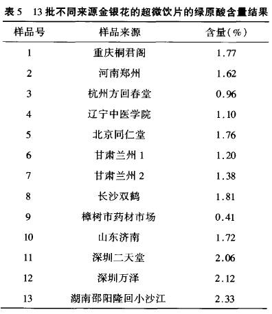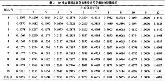将各色谱峰保留时间与同一图谱中参照物的保留时间比较,其比值为各色谱峰的相对保留时间,见表3。 2.5.2 共有指纹峰的相对峰面积 以图谱中绿原酸为参照物(s),将各共有指纹峰峰面积与同一图谱中参照物的峰面积比较,其比值为各共有指纹峰的相对峰面积。根据《中药注射剂指纹图谱研究的技术要求》的规定 J,单峰峰面积占总峰面积<10%时,峰面积比值不作要求,仅需标定相对保留时间,但我们将其全部标出。见表4。 2.6 金银花超微饮片中绿原酸的含量测定 2.6.1 绿原酸线性关系考察与含量测定 照《中国药典》⋯ 金银花项下的含量测定条件,精密量取配置好的绿原酸对照品不同浓度溶液,进样测定,以绿原酸进样量为横坐标,以峰面积响应值为纵坐标,绘标准曲线,得回归方程:Y= 1868110.526X+19735(r=0.9995)。绿原酸在0.19 ~0.95ug范围内与峰面积呈良好的线性关系。精密吸取对照品溶液10ul,供试品溶液10ul,分别注人高效液相色谱仪,测定峰面积,计算,即得。