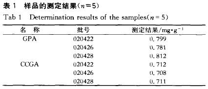 2.1.2 系统适用性色谱柱理论塔板数(N)按京尼平苷酸计酸为5200,与相邻峰分离度≥ 1.5,拖尾因子为1.15;按绿原酸计算N为5500,拖尾因子为1.08。 2.1.3 测定波长的选择分别取绿原酸和京尼平苷酸对照品溶液于紫外光区190~400 nm 范围内进行扫描,CGA的最大吸收波长在325 nm,第二吸收波长为238 nm,GPA的最大吸收波长则在235 nm左右,确定236 nm为测定波长。 2.2 对照品溶液的制备准确称取GPA对照品6.8mg、CGA对照品7.1 mg,用色谱纯甲醇溶解并定容至5 mL,得到浓度为1.36 g·L-1的GPA、1.42 g·L-1的CGA对照品混合储备液,冷藏保存。 2.3 样品溶液的制备 准确称取0.1 g杜仲颗粒样品,加人适量50 的甲醇一水溶液,超声溶解20 min 2次,移人25 mL量瓶中,再用50%的甲醇一水溶液定容至刻度,摇匀,过滤。准确吸取滤液1.0 mL于10mL量瓶中,用流动相稀释、定容至刻度,摇匀。用0.45um滤膜过滤后,即得待测液。 2.4 线性关系考察取对照品储备液用流动相溶液稀释,配制成对照品系列混合溶液,GPA:0.034,0.068,0.136,0.272,0.544 g ·I -1 ;CGA :0.034,0.071,0.142,0.284,0.568 g·L-1。各进样6ul,平行5次。结果GPA和CGA的峰面积y与其进样浓 度X(g·L-1)存在良好的线性关系: CGA :Y = 一608 71+ 4 322 500X ,r= 0.998 6,线性范围:0.036~0.568 g·L-1 GPA:Y = 一377 20+ 6 043 800X ,r= 0.996 9,线性范围:0.034~0.544 g·L-1 2.5 精密度试验精密吸取GPA含量为0.080 g·L-1;CGA为0.072 g·L-1 的样品溶液6 ul,重复进样5次,测得RSD分别为:GPA 0.61 %,CGA 0.72 %(n= 5)。 2.6 稳定性实验精密吸取GPA含量为0.080 g·L-1;CGA为0.072 g·L-1的混合溶液6 ul,每间隔一段时间进样测定一次,实验表明,该混合溶液在10 d内基本稳定。 2.7 加标回收率测定精密称取适量的已测定含量的样品5份,分别加人一定量的GPA、CGA对照品,采用2.3方法制备样品,过滤后分析,测定回收率,结果平均含量分别为99.03%,99.99%。 2.8 重复性试验 按“2.3”项制备杜仲颗粒样品溶液,进样6 ul,重复5次。试验结果测得GPA,CGA含量分别为0.799,0.712 mg·g-1,RSD 分别为0.134%,1.72%。 2.9 样品的测定分别对3批杜仲颗粒样品进行测定,各样品中GPA、CGA的含量测定结果见表1。