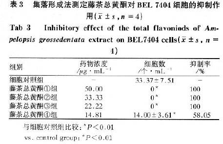 由表2可知,细胞培养第1、2天时,浓度为50.00、33.33μg·mL-1的藤茶总黄酮的抑瘤率与细胞对照组比较有显著性差异(P<0.01);培养第3、4天时,浓度为50.00、33.33、22.22μg·mL-1的藤茶总黄酮的抑瘤率与细胞对照组比较有显著性差异(P<0.05或P<0.01)。结果提示,藤茶总黄酮对培养的BEL7404细胞的增殖表现出显著的抑制作用,且成浓度-效 应关系。 2.4 集落形成法测定[5] 取对数生长期的单层培养细胞,用0.25%胰酶溶液消化并吹打成单个分散细胞悬液,进行活细胞记数。用含10%新生牛血清的1640培养液稀释成100个·mL-1细胞,接种于24孔板中,每孔加入1mL细胞,后加入不同浓度的藤茶总黄酮,每孔1mL,使其终浓度分别为75、50、33.33、22.22、14.81μg·mL-1,每个浓度均设3个复孔;细胞对照组加1640培养液1mL,混匀。将24孔板移入CO2箱,在37℃、5%CO2及饱和湿度环境下,静置培养8d。弃去培养液,用姬姆萨应用液染色,在镜下计数大于50个细胞的克隆数。抑制率(%)=(1试验组克隆数/对照组克隆数)×100%。集落形成法测定藤茶总黄酮对BEL7404细胞的抑制作用详见表3。