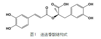 迷迭香酸(RosmarinicAcid,C18H16O8),化学名称为[R(E)]α-[[3-(3,4-二羟基苯基)-l-氧代-2-丙烯基]氧基]-3,4-二羟基苯丙酸((R)-α-[[3-(3,4-Dihydroxyphenyl)-1-oxo-2E-pro-penyl]oxy]-3,4-dihydroxy-benzenepropanoicacid),化学结构如图1。迷迭香酸为酚酸类化合物,浅黄色粉末,熔点为202~205℃,易溶于水、乙醇、甲醇,难溶于氯仿、乙醚等有机溶剂.